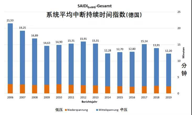 盡管近年來具有間歇性和不確定性的可再生能源發(fā)電比例一直在上升,德國仍然是世界上最可靠的電網(wǎng)之一,其電網(wǎng)安全穩(wěn)定性和供電可靠性都有一定的保障。根據(jù)德國聯(lián)邦網(wǎng)絡局(Federal Network Agency,Bundesnetzagentur)的數(shù)據(jù),2019年德國每個用戶的年平均停電時長為12.2分鐘,低于2019年的13.91分鐘,在整個歐洲及OECD國家中位列第二,僅次于瑞士,供電可靠率達到接近五個九的99.998%,綜合電壓合格率也極高。相比之下,其他歐盟國家如英國,法國和西班牙每年都有大約50分鐘的中斷。此外,根據(jù)美國能源信息署(EIA)的數(shù)據(jù),2019年美國的平均電力中斷事件為284分鐘(約4.7小時),即使除去山火,颶風和嚴重暴風氣候的影響,用戶的平均斷電時間也高達92分鐘,遠遠高于德國的水平。