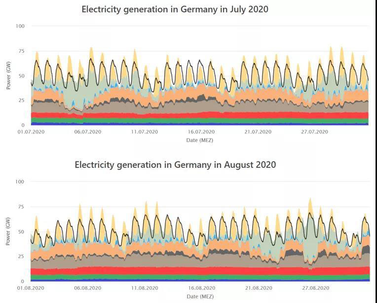 黑色曲線代表一個月內(nèi)的負荷曲線,不同顏色的色塊代表不同的發(fā)電源,由上至下:淺黃色為太陽能發(fā)電,淺綠色為海上風電與陸上風電之和,淺藍色則為抽水蓄能。接下來,橘黃色色塊為天然氣發(fā)電量,深、淺兩種棕色色塊則代表無煙煤與褐煤發(fā)電量之和。最底部構(gòu)成基礎(chǔ)負荷的則分別為核能(紅色),生物質(zhì)能(深綠色),及水力發(fā)電(深藍色)。下同。所有負荷曲線圖均來自Fraunhofer ISE研究所的Energy-Charts平臺。