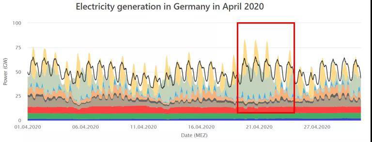 四月的負荷曲線中可以看出新冠流行的封鎖對總負荷量的影響更大了,整個負荷曲線向下移動了約10GW。光伏發(fā)電在四月總發(fā)電量中占比非常高,4月22日下午13:00,光伏設備共發(fā)電37.01GW,所有可再生能源發(fā)電占總負荷量約為84.6%。