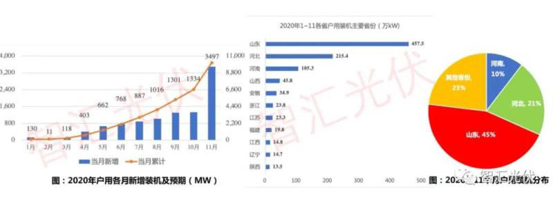 2020年1~11月,全國(guó)戶用累計(jì)裝機(jī)10.1226GW,比6GW指標(biāo)高出4.12GW。1~11月累計(jì)裝機(jī)中,山東、河北、河南三省新增均超過(guò)1GW,占比均超過(guò)10%;山東新增為4.6GW,占比達(dá)到45% ,三省累計(jì)77% 。
