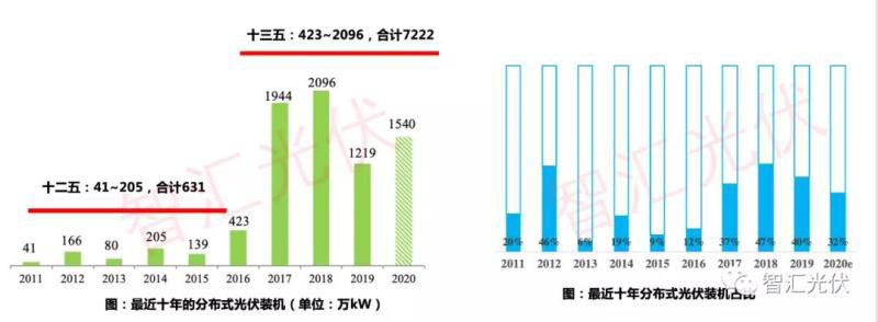 “十三五”期間,分布式光伏相對(duì)于前五年有10倍的增長(zhǎng);在總裝機(jī)中的占比由14%提高到32%;分布式發(fā)展受政策影響大。