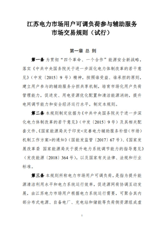 為貫徹“四個革命、一個合作”能源安全新戰(zhàn)略,落實《中共中央 國務(wù)院關(guān)于進一步深化電力體制改革的若干意見》(中發(fā)〔2015〕9 號)及配套文件、《國家能源局關(guān)于印發(fā)<完善電力輔助服務(wù)補償(市場)機制工作方案>的通知》(國能發(fā)監(jiān)管〔2017〕67號)、《國家發(fā)展改革委 國家能源局關(guān)于提升電力系統(tǒng)調(diào)節(jié)能力的指導(dǎo)意見》(發(fā)改能源〔2018〕364號)等有關(guān)要求,按照誰受益、誰承擔(dān)的原則,建立用戶參與的輔助服務(wù)分擔(dān)共享機制,我辦制定了《江蘇電力市場用戶可調(diào)負(fù)荷參與輔助服務(wù)市場交易規(guī)則(試行)》,現(xiàn)印發(fā)你們,請按通知要求認(rèn)真貫徹執(zhí)行。