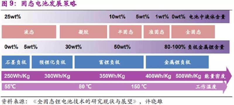 從下面這張表能看出,固態(tài)電池不是一蹴而就,而是有一個(gè)逐步進(jìn)化的過程。電池中的液體含量,從25%一路下降到0%,能量密度從250Wh/kg一路升到500Wh/kg以上,是一個(gè)個(gè)循序漸進(jìn),從液態(tài)、凝膠、半固態(tài)向準(zhǔn)固態(tài)、全固態(tài)電池的進(jìn)化升級(jí)過程。