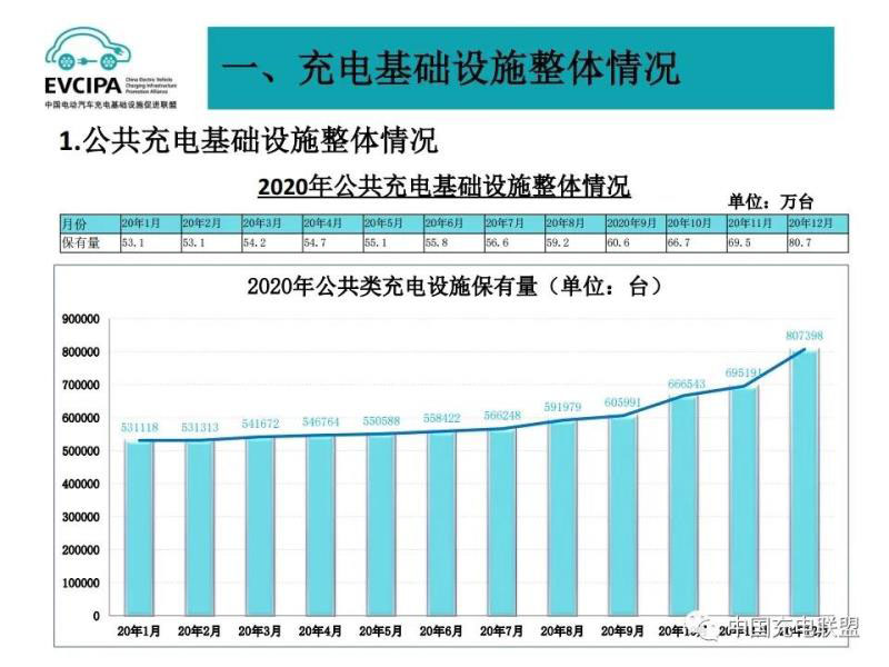 1、公共充電基礎設施運行情況,2020年12月比11月公共充電樁增加11.2萬臺,12月同比增長56.3%,臨近年底,運營商加大了公共充電樁投建和接入力度,導致增量數明顯。截至2020年12月,聯(lián)盟內成員單位總計上報公共類充電樁80.7萬臺,其中交流充電樁49.8萬臺、直流充電樁30.9萬臺、交直流一體充電樁481臺。從2020年1月到2020年12月,月均新增公共類充電樁約2.4萬臺。