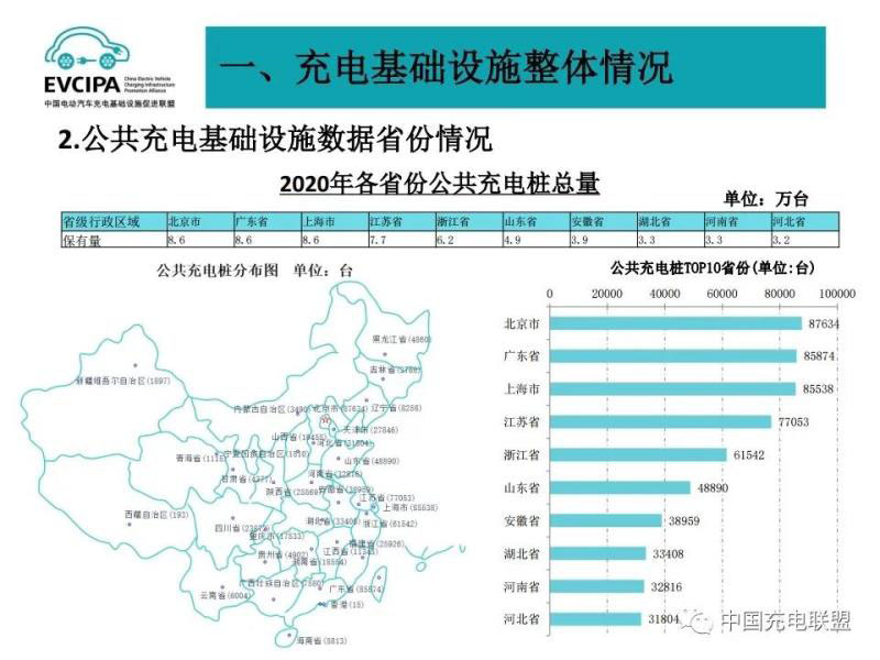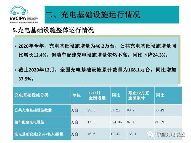 5、充電基礎設施整體運行情況,2020年全年,充電基礎設施增量為46.2萬臺,公共充電基礎設施增量同比增長12.4%,但隨車配建充電設施增量依然不高,同比下降24.3%。截止2020年12月,全國充電基礎設施累計數量為168.1萬臺,同比增加37.9%。