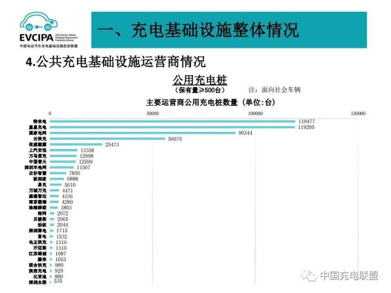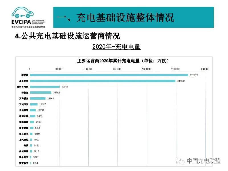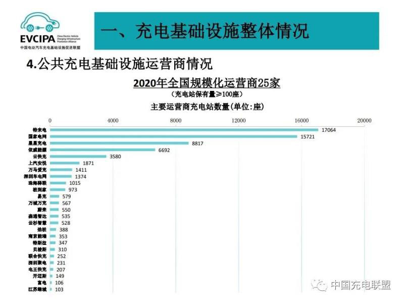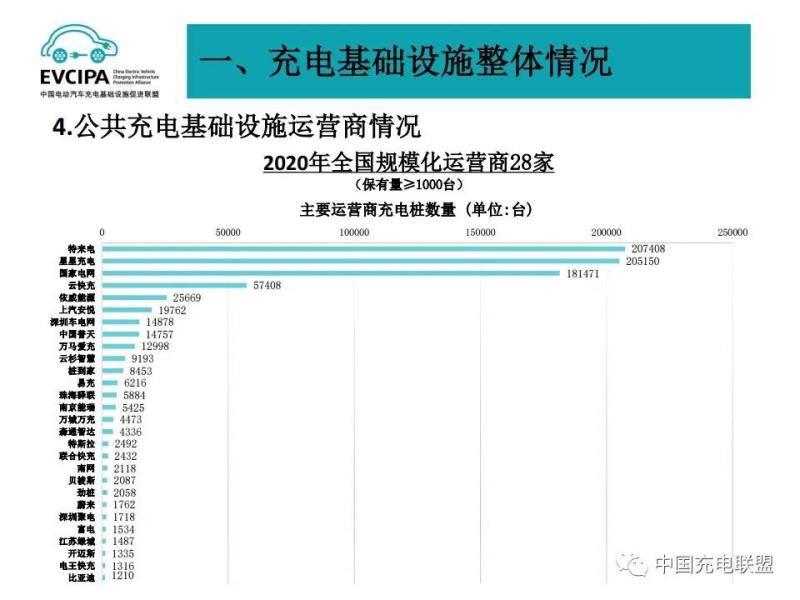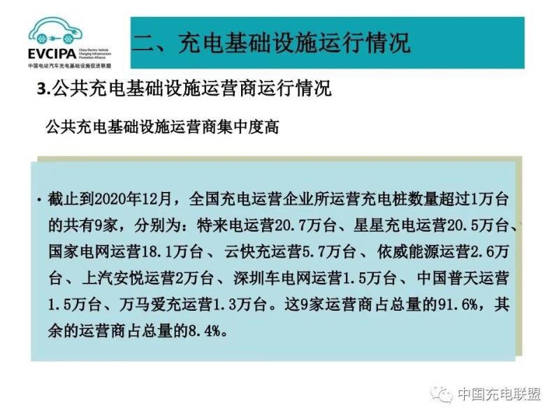 3、公共充電基礎設施運營商運行情況,截止到2020年12月,全國充電運營企業(yè)所運營充電樁數量超過1萬臺的共有9家,分別為:特來電運營20.7萬臺、星星充電運營20.5萬臺、國家電網運營18.1萬臺、云快充運營5.7萬臺、依威能源運營2.6萬臺、上汽安悅運營2萬臺、深圳車電網運營1.5萬臺、中國普天運營1.5萬臺、萬馬愛充運營1.3萬臺。這9家運營商占總量的91.6%,其余的運營商占總量的8.4%。