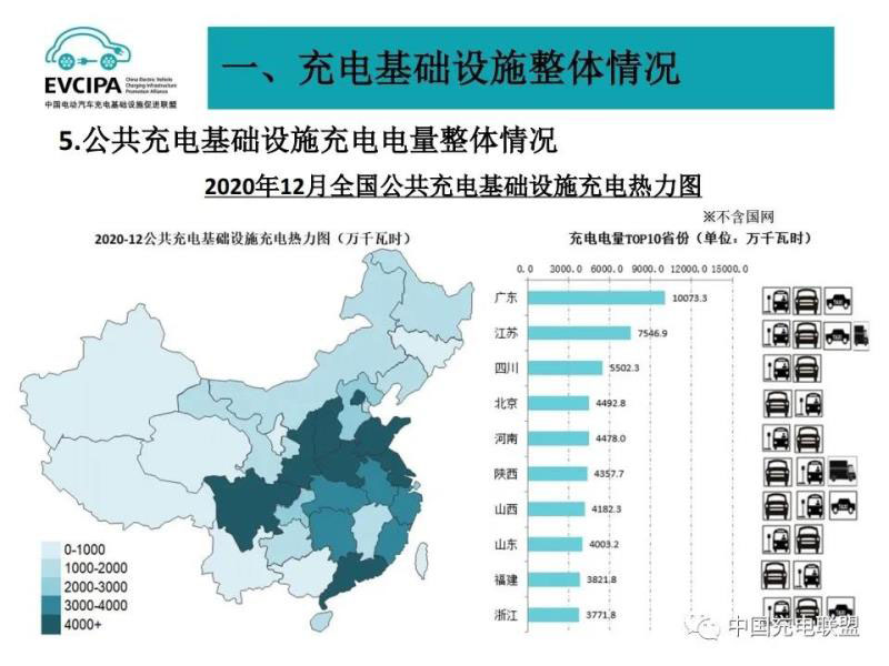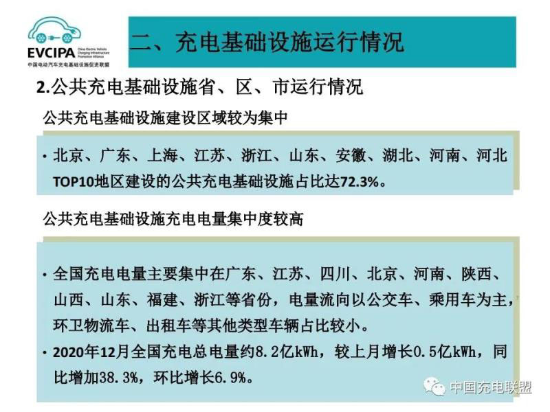 2、公共充電基礎設施省、區(qū)、市運行情況,北京、廣東、上海、江蘇、浙江、山東、安徽、湖北、河南、河北TOP10地區(qū)建設的公共充電基礎設施占比達72.3%。全國充電電量主要集中在廣東、江蘇、四川、北京、河南、陜西、山西、山東、福建、浙江等省份,電量流向以公交車、乘用車為主,環(huán)衛(wèi)物流車、出租車等其他類型車輛占比較小。2020年12月全國充電總電量約8.2億kWh,較上月增長0.5億kWh,同比增加38.3%,環(huán)比增長6.9%。