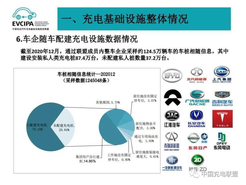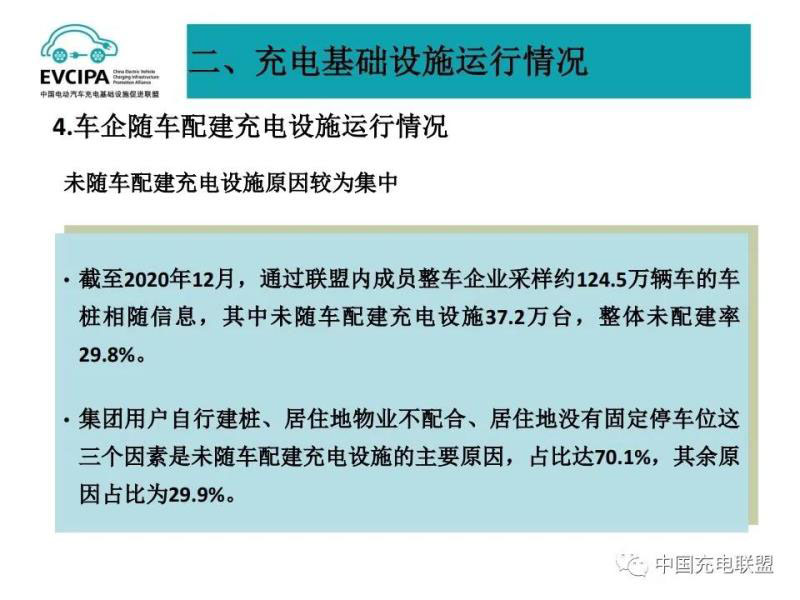 4、車企隨車配建充電設施運行情況,截至2020年12月,通過聯(lián)盟內成員整車企業(yè)采樣約124.5萬輛車的車樁相隨信息,其中未隨車配建充電設施37.2萬臺,整體未配建率29.8%。集團用戶自行建樁、居住地物業(yè)不配合、居住地沒有固定停車位這三個因素是未隨車配建充電設施的主要原因,占比達70.1%,其余原因占比為29.9%。