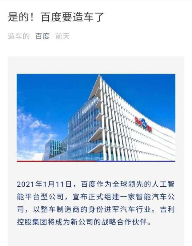 話未落音,百度就宣布以整車制造商的身份進(jìn)軍智能汽車界,位于杭州的吉利汽車,便是其新公司的戰(zhàn)略合作伙伴,雙方將在智能汽車制造相關(guān)領(lǐng)域展開(kāi)緊密合作,共同打造下一代智能汽車。