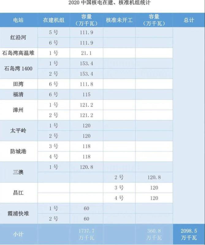 至此,中國核電“十三五”的成績單定格在在運(yùn)機(jī)組49臺(tái),總裝機(jī)容量約5103萬;在建機(jī)組16臺(tái),總裝機(jī)容量約1738萬千瓦;另有3臺(tái)機(jī)組(總裝機(jī)361萬千瓦)獲得國務(wù)院核準(zhǔn)后尚未開工。在運(yùn)、在建及核準(zhǔn)機(jī)組總?cè)萘窟_(dá)到7202萬千瓦。