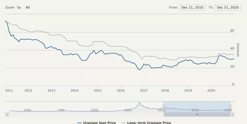 鈾資源方面,中國核電的鈾資源主要通過國內(nèi)開采、海外開發(fā)和海外采購三種途徑共同來滿足。除國內(nèi)的開采能力之外,中廣核、中核在非洲、澳大利亞、中亞多年來投資確保了相當(dāng)數(shù)量的鈾資源。而國際市場上,天然鈾的長協(xié)和現(xiàn)貨價(jià)格在2011年之后就一路下滑,最近五年都在20至40美元每磅的低位徘徊,在國際市場上買鈾既不難也不貴。