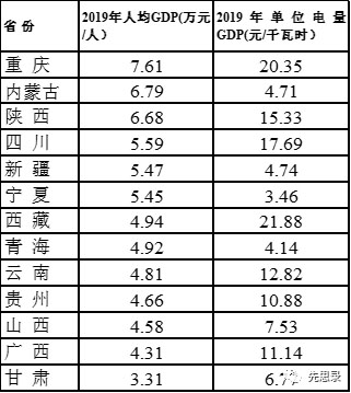 表1. 2019年西部省份人均GDP及單位電量GDP情況