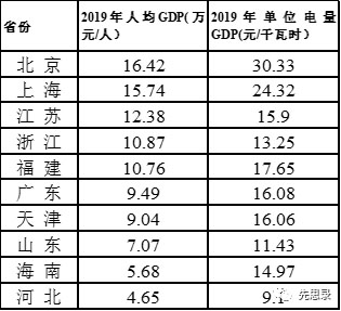 表2. 2019年東部省份人均GDP及單位電量GDP情況