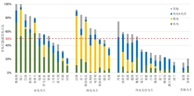 圖3 主要國(guó)家非化石能源發(fā)電占比