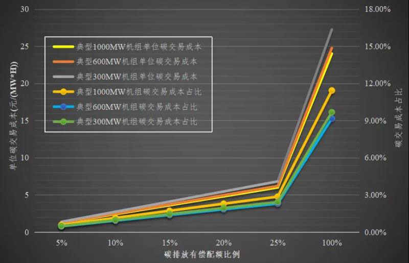 基于前述規(guī)則,筆者以目前參與廣東碳市場的典型火電燃煤機組(裝機容量分別為300MW、600MW和1000MW)作為研究對象,測算在不同碳價格和不同有償配額比例情況下,電廠購買碳配額的單位交易成本以及占發(fā)電機組變動(燃料)成本的比重。