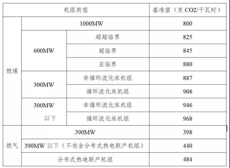 電力行業(yè)燃煤燃氣發(fā)電機組(含熱電聯(lián)產(chǎn)機組)使用基準線法分配配額,對單位產(chǎn)品的二氧化碳排放量設置標準。計算公式為:控排企業(yè)碳排放配額=產(chǎn)量×基準值(見表1);新建項目企業(yè)碳排放配額=設計產(chǎn)能×基準值(見表1)。特殊燃料發(fā)電機組(如煤矸石、油頁巖、水煤漿、石油焦等燃料)以及供熱鍋爐采用歷史強度下降法分配配額,即要求排放單位年度碳排放強度與自身的歷史碳排放強度相比有所下降。