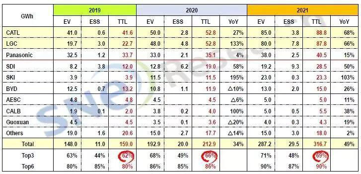 (表中EV即電動(dòng)車用的動(dòng)力電池產(chǎn)能,數(shù)據(jù)來自韓國市場調(diào)研機(jī)構(gòu)SNE Research)