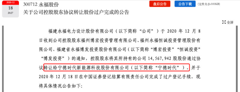 之后,寧德時代繼續(xù)在鋰電產(chǎn)業(yè)上進行投資,2020年12月10日,永福股份發(fā)布公告稱寧德時代將持有其1456.8萬股股份,將占永福股份總股本的7.998%,憑借這些股份,寧德時代將會成為永福股份的第三大股東。