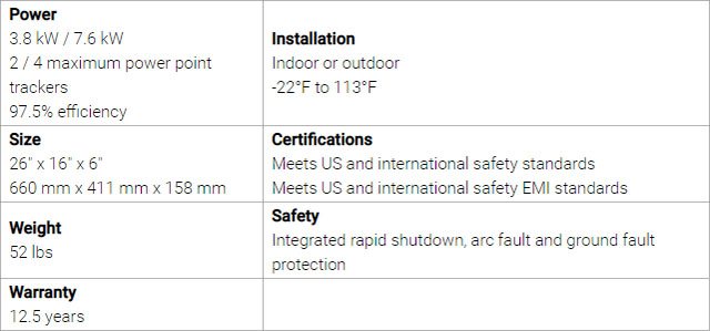 有新買家表示,新款逆變器已能夠與特斯拉的 Solar Roof 光伏裝置一起安裝,感興趣的朋友可訪問官方網(wǎng)站獲取詳情。以下是特斯拉列出的某些關(guān)鍵規(guī)格:
