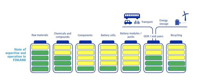 芬蘭經(jīng)濟(jì)部的報告指出,芬蘭擁有發(fā)展電池產(chǎn)業(yè)所需的專業(yè)知識和原材料。芬蘭在電池價值鏈中擁有堅實(shí)的專業(yè)知識:采礦行業(yè)、電池原材料提煉、電池生產(chǎn)和使用相關(guān)技術(shù)和服務(wù)、充電技術(shù)和回收解決方案。