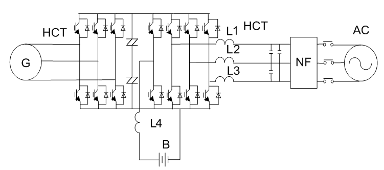 燃?xì)廨啓C(jī)利用氣體作為工質(zhì)在燃燒室里燃燒,將燃料的化學(xué)能轉(zhuǎn)變?yōu)闅怏w的內(nèi)能。在汽缸里,氣體的內(nèi)能轉(zhuǎn)變?yōu)闅怏w的動(dòng)能,燃?xì)飧咚賴姵?,沖擊葉輪轉(zhuǎn)動(dòng),葉輪驅(qū)動(dòng)主軸,再帶動(dòng)發(fā)電機(jī)旋轉(zhuǎn)產(chǎn)生電能。為了獲得較高的發(fā)電效率,燃?xì)廨啓C(jī)的主軸轉(zhuǎn)速通常達(dá)數(shù)萬(wàn)轉(zhuǎn)/分,其產(chǎn)生的電能頻率達(dá)數(shù)百赫茲,無(wú)法與電網(wǎng)直接相連,必須通過(guò)交直、直交變換才能聯(lián)網(wǎng)或供給用電設(shè)備。再加上這類裝置需要電動(dòng)啟動(dòng),變換裝置還需具備雙向流通的能力。這就使得其中變流器具有較復(fù)雜的功能,典型電路示例如圖4所示。圖中,電池B用作能量緩沖及無(wú)電網(wǎng)送電時(shí)始動(dòng)之用。