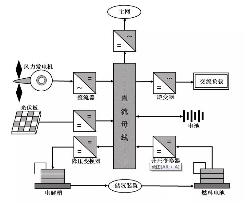 氫研究所(HRI)開(kāi)發(fā)了一套系統(tǒng),將可再生能源系統(tǒng)產(chǎn)生的能量以氫氣形式進(jìn)行儲(chǔ)存,如圖3所示。該系統(tǒng)包括直流負(fù)載母線、風(fēng)力發(fā)電機(jī)、太陽(yáng)能電池板、燃料電池系統(tǒng)和氫轉(zhuǎn)換系統(tǒng)。連接到直流母線的降壓DC-DC變換器用于將母線電壓降低到適合電解的電壓水平。電解水獲得的氫氣被儲(chǔ)存在一個(gè)特殊的儲(chǔ)存管中。儲(chǔ)存的氫氣通過(guò)燃料電池(PEMFC)轉(zhuǎn)換為電能。燃料電池產(chǎn)生的能量通過(guò)升壓DC-DC變換器傳輸?shù)较到y(tǒng)直流母線。