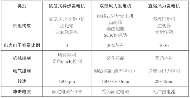 風(fēng)能具有波動(dòng)性和隨機(jī)性,無(wú)法存儲(chǔ),因而無(wú)法像傳統(tǒng)能源利用中那樣,在保持一次能源相對(duì)穩(wěn)定的情況下產(chǎn)生電能,這就要求風(fēng)力發(fā)電系統(tǒng)具有很強(qiáng)的調(diào)節(jié)能力和適應(yīng)性,這正是柔性化技術(shù)的核心。風(fēng)力發(fā)電機(jī)按異步型和同步型分類,可以分為鼠籠式異步發(fā)電機(jī)、雙饋風(fēng)力發(fā)電機(jī)、直驅(qū)風(fēng)力發(fā)電機(jī)三種,其機(jī)組控制特性構(gòu)成對(duì)比如表2所示。
