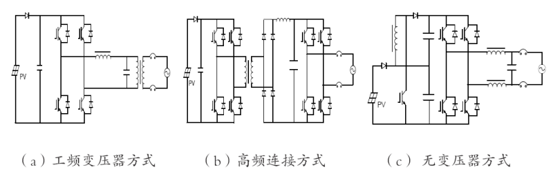 光伏發(fā)電中電力電子變換電路的形式通常有工頻變壓器方式、高頻連接方式及無(wú)變壓器方式,如圖2所示。工頻變壓器方式采用工頻隔離,具有造價(jià)低、不宜小型輕量化等特點(diǎn)。高頻連接方式采用高頻逆變后,通過(guò)變壓器隔離,再經(jīng)過(guò)整流逆變與系統(tǒng)相連,體積相對(duì)較小,但存在造價(jià)高、效率較低等問(wèn)題。無(wú)變壓器方式通過(guò)升壓斬波器、逆變器和濾波器,直接與電力系統(tǒng)相連,造價(jià)適中,宜于小型輕量化。