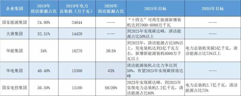 而大唐集團(tuán)和華能集團(tuán)給出的目標(biāo)則是,到2025年清潔能源裝機(jī)超過(guò)50%,國(guó)家電投給出的目標(biāo)最高,到2025年達(dá)到60%。