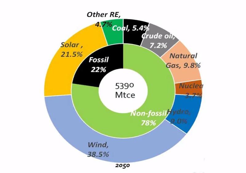 根據(jù)《2020年中國(guó)可再生能源展望報(bào)告》,為了實(shí)現(xiàn)巴黎協(xié)定將溫度變化控制在2度的目標(biāo)。中國(guó)非化石能源比重未來(lái)會(huì)持續(xù)高速增長(zhǎng),十四五達(dá)到25%,十五五達(dá)到34%,十六五達(dá)到42%。最終到2050年,中國(guó)非化石能源比重將提升至78%,煤炭消費(fèi)相比2019年下降90%,二氧化碳排放相比2019年下降76%。