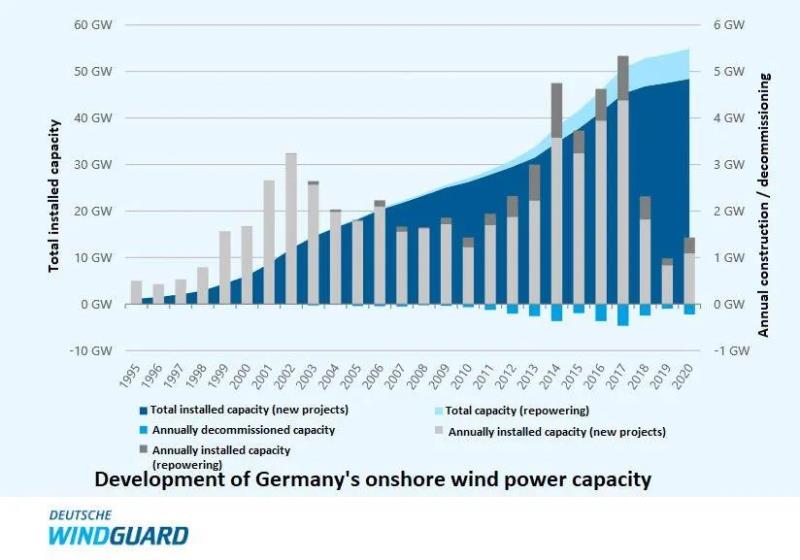 如果考慮到2020年拆除了203臺(tái)老舊和小的風(fēng)機(jī),實(shí)際凈增217臺(tái)新安裝的風(fēng)機(jī)(裝機(jī)凈增1.2吉瓦),德國陸上風(fēng)電現(xiàn)有裝機(jī)約為56吉瓦。2020年,陸上風(fēng)電約占德國總發(fā)電量的20%,在可再生能源電源中所占份額最大。德國風(fēng)電直接維持了約10萬個(gè)就業(yè)崗位,每年創(chuàng)造150億歐元的營業(yè)收入。與此同時(shí),德國也在逐步淘汰煤炭和核能,并計(jì)劃促進(jìn)電動(dòng)汽車和綠色制氫,這使得豐富的可再生能源變得越來越必要。