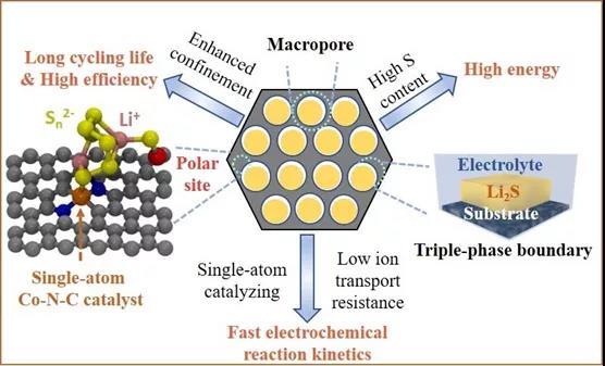 為了解決上述問題,Zhao教授團(tuán)隊與國際研究人員合作,提出了一種陰極設(shè)計概念,可以實現(xiàn)良好的鋰硫電池性能。研究人員將硫均勻地嵌入到高度定向的大孔中,同時該大孔內(nèi)部嵌有豐富分活性位點,以緊緊地吸附多硫化物,消除穿梭效應(yīng)以及鋰金屬腐蝕影響。通過為鋰硫電池提出新型硫陰極設(shè)計原則,該聯(lián)合小組提升了該電池的能量密度,并為實現(xiàn)該電池的工業(yè)化邁進(jìn)了一大步。