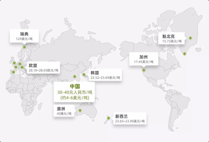 全球主要市場碳價格(數(shù)據(jù)來自于全球主要碳交易所)