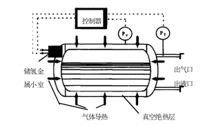 在外容器上設(shè)置一個(gè)與夾層連接的金屬儲(chǔ)氫小室,所使用儲(chǔ)氫金屬在常溫下可以達(dá)到很高的真空度。儲(chǔ)氫金屬加熱時(shí),釋放出數(shù)毫克的氫氣,夾層的壓力上升,環(huán)境熱量通過(guò)夾層導(dǎo)入內(nèi)容器。停止加熱后,氫氣迅速被儲(chǔ)氫金屬吸附,真空壓力和夾層絕熱能力恢復(fù)。這種方式通過(guò)小功率的加熱,即可對(duì)容器內(nèi)部輸入較大熱流,消耗電能僅為壓力維持總能量的5%,因此,這種模式可以稱為熱放大器。