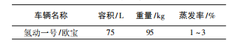 上世紀(jì)80年代初,作為美國(guó)能源部(Depart-mentofEnergy,DOE)“替代燃料實(shí)施項(xiàng)目”的一部分,LASL同聯(lián)邦德國(guó)航空航天研究試驗(yàn)院(DFVLR)、新墨西哥能源研究所(NMEI)合作,對(duì)氫能汽車進(jìn)行了為期兩年半的試驗(yàn)研究工作,該項(xiàng)試驗(yàn)的首要任務(wù)是研究車載液氫存儲(chǔ)和加注。測(cè)試的液氫氣瓶包括兩件,并采用通用(GM)公司別克1979款“世紀(jì)”汽油內(nèi)燃機(jī)轎車作為載體進(jìn)行了路試,氣瓶與原車汽油箱參數(shù)如表2所示。
