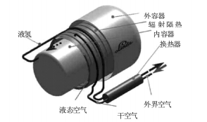 為此,林德公司冷量回收技術(shù),實(shí)現(xiàn)了車輛停放時(shí)液氫無(wú)損存儲(chǔ)12d的記錄,其氣瓶結(jié)構(gòu)原理如圖2所示。在氣瓶向發(fā)動(dòng)機(jī)供氣時(shí),采用氣化換熱器獲得液化空氣,存儲(chǔ)冷量。停車后,氣瓶不工作時(shí),液化空氣進(jìn)入夾層空間外側(cè),吸收外界漏熱,從而實(shí)現(xiàn)更長(zhǎng)的液氫無(wú)損儲(chǔ)存時(shí)間。