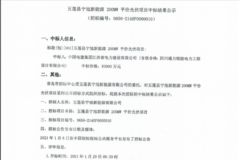 中國儲(chǔ)能網(wǎng)訊:日前,根據(jù)中國招投標(biāo)公共服務(wù)平臺(tái)信息顯示,中國電建江西省電力建設(shè)公司(含聯(lián)合體:四川通力恒能電力工程設(shè)計(jì)有限公司)以總價(jià)8.3億元,單價(jià)4.15元/瓦中標(biāo)五蓮縣寧旭新能源公司200MW平價(jià)光伏EPC項(xiàng)目。具體中標(biāo)公告見下: