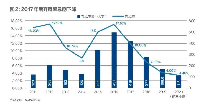 棄風(fēng)棄光一度是困擾中國新能源發(fā)展的關(guān)鍵問題,2016年前后,棄風(fēng)率一度超過30%,2017年之后雖然迅速緩解,但在未來更高比例的新能源裝機(jī)下,消納隱憂依然揮之不去。