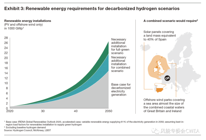 氫脫碳情景下可再生能源需求情況(混合模式下,用太陽能的話面積相當(dāng)于40%西班牙國土面積,用海上風(fēng)電則需要在英國和愛爾蘭海域全部安裝上風(fēng)機(jī))