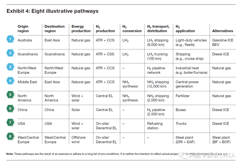 報告從一次能源到氫能過程選擇了8個價值鏈進(jìn)行說明。