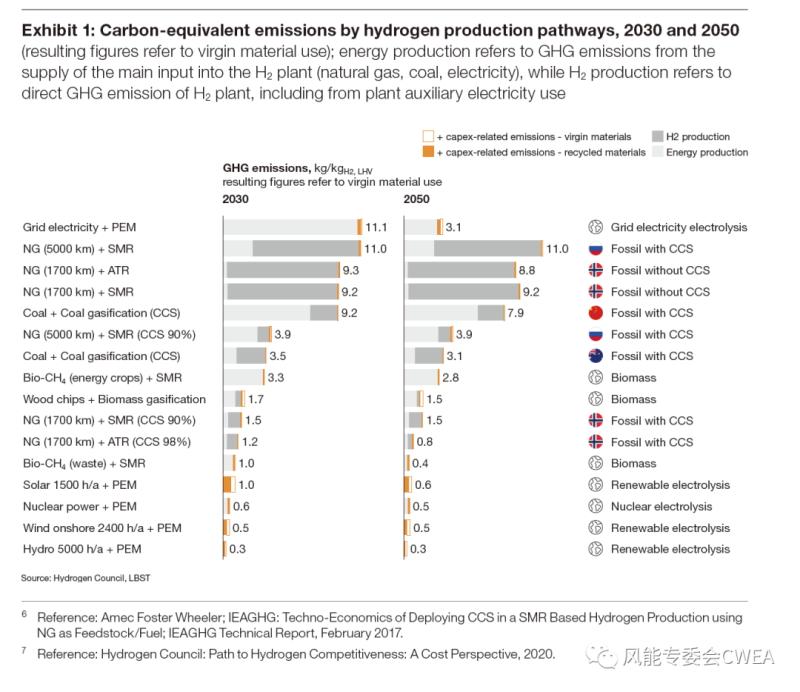 圖1:2030和2050年制氫途徑的碳排放量比較