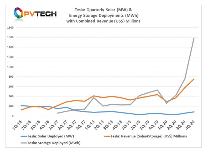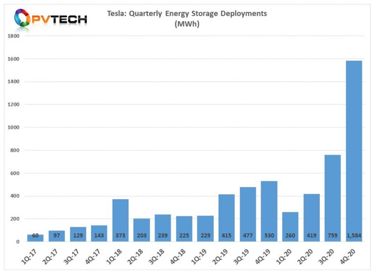 特斯拉公司在2020年第四季度部署的儲能系統(tǒng)(EES)儲能容量達到創(chuàng)紀錄的1,584MWh,而第三季度為759MWh。盡管該公司住宅儲能部署也在增長,但部署了更多電網(wǎng)規(guī)模的儲能系統(tǒng)是其實現(xiàn)顯著增長的關(guān)鍵。