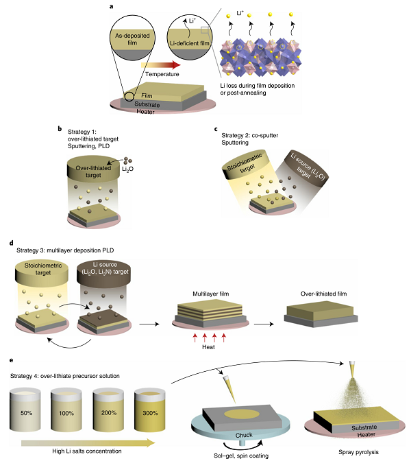 在鋰基氧化物的情況下,鋰在沉積過程中容易損失(圖5a),經(jīng)常導(dǎo)致非化學(xué)計(jì)量比的膜。為了補(bǔ)償沉積過程中的鋰損失,濺射膜的兩個(gè)靶的共沉積(圖5c)和PLD膜的過鋰化陶瓷目標(biāo)的共沉積(圖5b)是所使用的典型策略。然而,對于僅使用過鋰化陶瓷顆粒作為靶的PLD膜來說,大多數(shù)結(jié)晶固態(tài)電解質(zhì)材料(包括LLZO和LLTO)和電極材料(包括尖晶石和層狀材料)在其高鋰化相中的穩(wěn)定是困難的。最近,在沉積期間,采用內(nèi)部鋰源的陶瓷處理被引入,使用Li3N和石榴石鋰的第二靶和后退火(圖5d),以成功克服沉積期間的鋰損失。