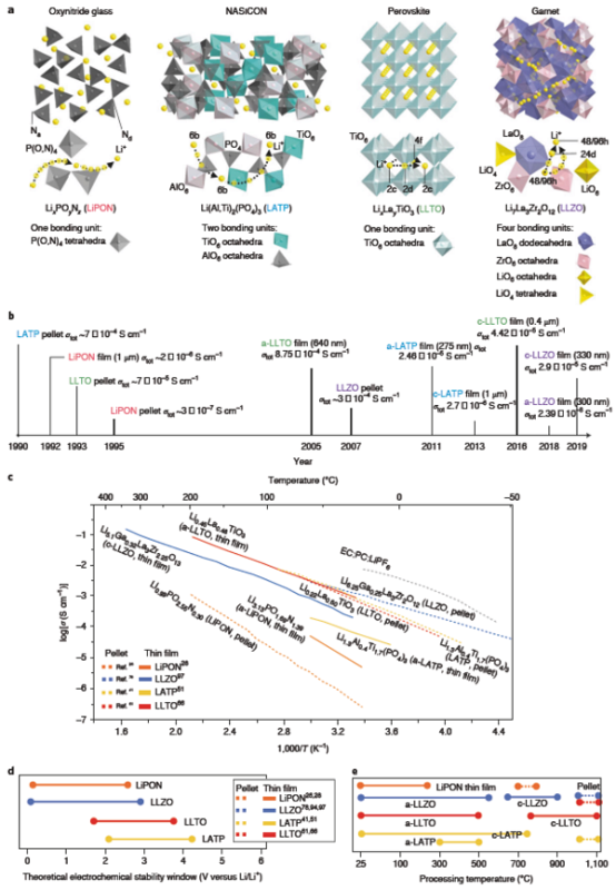 在室溫下達(dá)到電導(dǎo)率10-7–10-3 S·cm-1的鋰離子傳導(dǎo)陶瓷是基于氧氮化物玻璃(LiPON)和NASICON型、鈣鈦礦型和石榴石型結(jié)構(gòu)(圖3a)。要將鋰離子傳導(dǎo)陶瓷從傳統(tǒng)的大顆粒轉(zhuǎn)變?yōu)閿?shù)百納米厚的薄膜,需要付出巨大的努力:平均而言,從相應(yīng)的顆粒開始,需要十多年的額外開發(fā)時(shí)間來了解陶瓷膜的化學(xué)、沉積和特性(圖3b)。LiPON是一個(gè)例外,它的薄膜加工路線是在無定形LiPON顆粒之前建立的。對這些陶瓷薄膜進(jìn)行加工的未來機(jī)遇在于確定其化學(xué)性質(zhì),并更深入地了解其結(jié)構(gòu)、相和鋰離子傳輸之間的關(guān)系,這將在決定它們作為未來固態(tài)電池的“薄”電解質(zhì)方面發(fā)揮作用(圖3c-e)。
