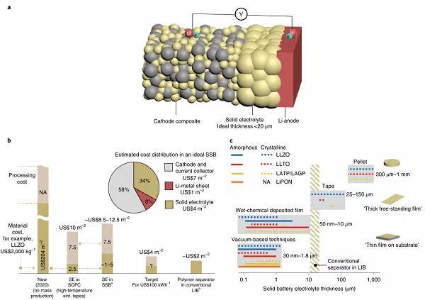 圖1 鋰金屬基固態(tài)電池的成本和設(shè)計(jì)考慮。(a)鋰金屬基固態(tài)電池的設(shè)計(jì)結(jié)構(gòu);(b)固態(tài)電池成本預(yù)測;(c)固態(tài)電解質(zhì)的典型厚度范圍。