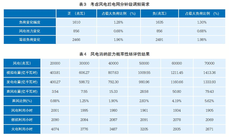 調(diào)頻約束下風電消納能力評估。首先根據(jù)該省級電網(wǎng)風電的歷史出力特性,模擬生成規(guī)劃年風電時序出力,進而計算得到分鐘級出力變化的標準差為123兆瓦,風電分鐘級出力變化最大幅值為856兆瓦。同時,統(tǒng)計該省歷史負荷小時級波動,推算得到規(guī)劃年小時級負荷變化幅度為-24530兆瓦~+24150兆瓦。負荷分鐘級變化幅度一般為小時級變化幅度的1/15到1/40且正負變化概率大致相等,本文負荷分鐘級變化為小時級變化幅度的1/15,則近似計算出負荷分鐘級變化的區(qū)間為-1635兆瓦~+1610兆瓦。通過對風電出力與負荷分鐘級變化的分析,可得到風電接入后的系統(tǒng)調(diào)頻需求,結果如表3所示。