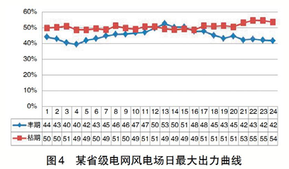 從統(tǒng)計結果來看,全省風電日最大出力豐期的出力范圍為40%~51%,午后12時到下午5時最大出力較高;枯期的出力范圍為49%~55%,晚上9時到凌晨最大出力較高。