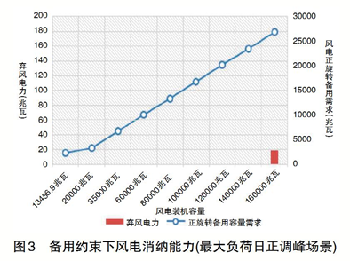 對于備用約束,選取備用需求最大以及火電提供旋備比例最低的場景作為備用約束下的關鍵場景;逐步增加風電裝機容量,使用軟件進行運行模擬,直至系統(tǒng)備用不足或者出現(xiàn)棄風,則該臨界場景下風電容量即為備用約束下風電可消納容量。