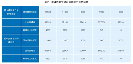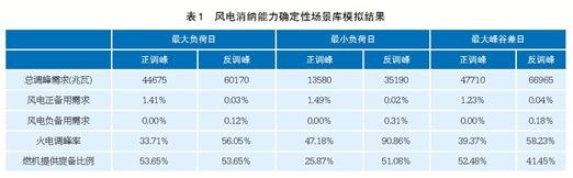 調(diào)峰約束下風電消納能力評估。選取確定性場景庫分析指出的影響風電消納的調(diào)峰約束關鍵受限場景:最大峰谷差日反調(diào)峰場景以及最小負荷日反調(diào)峰場景,逐步增加風電裝機容量,使用軟件進行運行模擬,直至系統(tǒng)調(diào)峰能力不足出現(xiàn)棄風,則該臨界場景下風電容量即為調(diào)峰約束下風電可消納容量。仿真結果如表2所示。