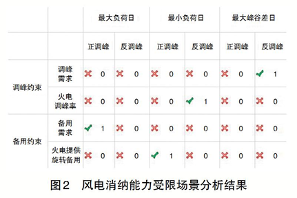 對于調(diào)峰約束,選取調(diào)峰需求最大及火電調(diào)峰率最高的場景作為調(diào)峰約束下的關鍵場景;逐步增加風電裝機容量,使用軟件進行運行模擬,直至系統(tǒng)調(diào)峰能力不足出現(xiàn)棄風,則該臨界場景下風電容量即為調(diào)峰約束下風電可消納容量。